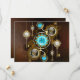Turquoise lenses with antique watch with brass gears and golden keys on rusty, brown background. Steampunk style.