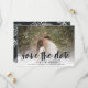 Une carte moderne de "save the date" avec une typographie manuscrite fraîche et décontractée qui évoque l'aspect d'un marqueur à pinceau. Conçue pour accueillir votre photo de fiançailles horizontale ou en paysage à fond perdu, cette carte chic présente une superposition noire douce avec vos noms, date de mariage et lieu de mariage superposés sur un dégradé blanc pour un contraste de texte. Les cartes sont imprimées au verso avec un motif de contour floral blanc et comportent un espace pour inclure l'URL de votre site web de mariage ou toute autre information que vous souhaitez.