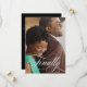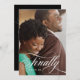 Une carte d'annonce de save the date élégante, qui présente votre photo de fiançailles préférée surimposée de "Enfin" dans une police de caractères cursive blanche élégante et votre date de mariage. Le verso est en noir uni avec vos détails de mariage en noir.