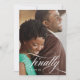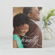 Une élégante carte d'annonce de date de sauvegarde, qui présente votre photo de fiançailles préférée surimposée de "Enfin" dans une police de caractères cursive blanche élégante et la date de votre mariage. Le verso est en noir uni avec les détails de votre mariage en noir.