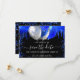 Un arrière - plan noir décoré de gouttes bleues royales, confettis et ballons. Personnalisez et ajoutez une date et un nom/âge. Le texte : Save the Date est écrit avec un grand script de style à la main tendance.