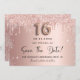 Une fille et tendance Enregistrer la carte Date pour une Sweet 16, 16e anniversaire fête. arrière - plan d'or rose faux métallique décoré d'or rose et de parties scintillant faux argent gouttes et poussière. Personnalisez et ajoutez une date et un nom/texte. Le texte : Save the Date est écrit avec un grand script de style à la main tendance avec des swashes. Numéro 16 avec une police de style ballon.