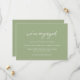 Mariage moderne enregistrer la carte de date avec un design typographique contemporain avec "nous sommes engagés" dans la typographie de script élégante. Vous trouverez ci-dessous les détails de votre événement dans une mise en page simple et minimale. Le thème de couleur est vert sage et peut être modifié par l'outil d'édition de conception.
