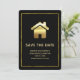 Enregistrez la carte de date avec une simple image d'une maison en dégradé d'or sur un arrière - plan noir.