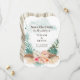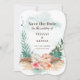 Carte de rendez-vous inspirée des îles avec un arrangement d'hibiscus, de fleurs de flamingo et de jasmin, et de feuilles de palmier sur un fond lavé à l'aquarelle bleu aqua. Le verso représente une feuille de palmier éventail abstraite dans des tons beige kaki et taupe. Parfait pour les thèmes de plage, de destination et tropicaux.
