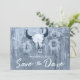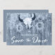 Cette douce rustique bleu roux western boho tournesol Save The Date cartes plates sont une excellente façon d'informer vos invités de votre jour de mariage. Rodéo cowboy taureau crâne avec cornes texture florale pays, grange bois vintage bohème. Conception de style cowgirl de ferme. Recherchez les produits correspondants dans cette collection. Copyright de l'image Marg Seregelyi Photography.