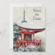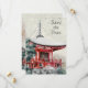 Cette invitation Save the Date de mariage capture la beauté orientale du Japon. Il dispose d'un bel arrière - plan naturel avec un temple bouddhiste japonais peint et verdure.