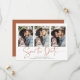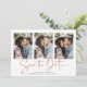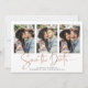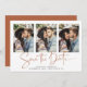 Modern manuscrit Enregistrer la Date Multiple Carte photo en terre cuite rouille et blanc dans une police qui est élégant et évoque une sensation manuscrite romantique. Conçu pour utiliser trois de vos photos préférées pour une personnalisation supplémentaire. Ajoutez facilement vos noms et dates pour un design vraiment personnalisé. Veuillez nous contacter à cedarandstring@gmail.com si vous avez besoin d'aide pour la conception ou les produits correspondants.