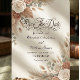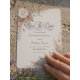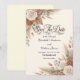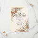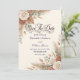 Announce your special day with earthy warmth and elegant floral charm, featuring an inviting blend of burnt orange, muted clay, and delicate greenery.This design centers on an asymmetrical composition of warm-toned dried palm elements, wheat stems, and lush eucalyptus foliage, creating a natural frame around sophisticated serif and flowing script typography. The color palette masterfully balances deep burnt orange and peach hues against a soft cream background, utilizing shading and light to create visual depth and a soft, painterly aesthetic.This is a flat printed image with a watercolor botanical texture effect, not actual raised material.