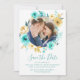 Turquoise / Tiffany Gold Floral Wreath - Photo Save the Date Card. (1) Pour plus de personnalisation, cliquez sur le lien "customiser plus loin" et utilisez notre outil de conception pour modifier ce modèle. (2) Si vous préférez les papiers plus épais / Finition mat, vous pouvez envisager de choisir le type de papier mat. (3) Si vous avez besoin d'aide ou d'articles correspondants, veuillez me contacter.
