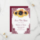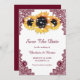 Mariage de tournesol bordeaux personnalisé enregistrer les cartes de date avec tournesol, lumières à cordes et dentelle florale bordeaux. Objets correspondants disponibles pour compléter ces mariages rustiques chic bordeaux enregistrer les cartes de date.