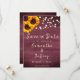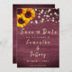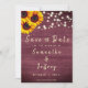 Invitation amis et famille à votre mariage rustique! Cette belle sauvegarde la carte de date représente un tournesol, arrière - plan de bois bordeaux et lumières à cordes. Customisez avec vos noms, la date du mariage et le libellé de votre choix. Voir d'autres objets de cette collection avec ce design de tournesol en bois rustique.