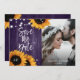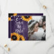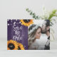 Le tournesol rustique violet sauve les cartes photos de date avec des tournesols contre un arrière - plan en bois de grange orné de lampes à cordes.