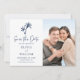 Cet élégant mariage de plage tropicale bleu marine, à l'exception de la carte datant, présente deux palmiers au-dessus du texte, un script d'écriture élégante pour le faire-part "Save the Date", et une photo du couple heureux.