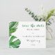 This elegant tropical design features lush green watercolor leaves framing a clean and modern layout. The fresh botanical elements, including palm and monstera-inspired foliage, create a natural and sophisticated look perfect for destination weddings, beach ceremonies, or garden celebrations. With its minimalist style and vibrant greenery, this design brings a refreshing, organic feel to your special announcement.
