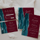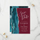 Le bord gauche de cet élégant mariage moderne, sauf la carte de date dispose d'une bordure d'aquarelle bleu turquoise, découpée avec une fausse parties scintillant argent. Le texte personnalisable combine écriture gris argenté, copperplate et polices italiques sur un arrière - plan bordeaux.