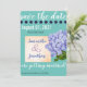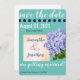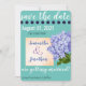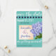 Personnalisez ce fichier enregistrez la carte de date avec votre date mariage, le lieu et les noms de la mariée et du marié. La carte a un jeu de couleurs turquoise, marine et violet avec une hydrangée.