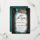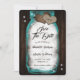 Mariage turquoise rustique enregistrez la carte de date avec un pot en maçon avec des lumières à cordes et des coeurs de burlap contre un arrière - plan en bois de grange orné de lumières scintillantes. Personnalisez facilement ce joli mariage rustique turquoise enregistrer la date en ligne. Objets correspondants disponibles pour compléter ce mariage turquoise enregistrer la date.