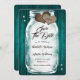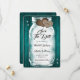 Mariage turquoise rustique enregistrez la carte de date avec un pot en maçon avec des lumières à cordes et des coeurs de burlap contre un arrière - plan en bois de grange orné de lumières scintillantes. Personnalisez facilement ce joli mariage rustique turquoise enregistrer la date en ligne. Objets correspondants disponibles pour compléter ce mariage turquoise enregistrer la date.