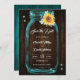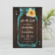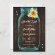 Mariage rustique turquoise et tournesol personnalisé enregistrer les cartes de date avec un pot de mason avec un tournesol et verdure contre un arrière - plan en bois de grange orné de lumières scintillantes. Personnalisez facilement en ligne. Objets correspondants disponibles pour compléter ce mariage turquoise, enregistrer les dates.