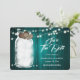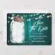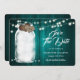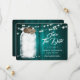 Mariage turquoise rustique enregistrez la carte de date avec un pot de maçon et les coeurs de burlap contre un arrière - plan en bois de grange orné de lampes à cordes. Personnalisez facilement ce mariage rustique romantique turquoise enregistrer la date en ligne. Objets correspondants disponibles pour compléter ce mariage turquoise enregistrer la date.