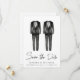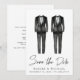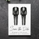 Élégante et chic annonce de mariage gay 'Save the Date' avec deux aquarelles de tuxedo et 'Save the Date' dans un script stylisé. Ajoutez vos noms, date de mariage et lieu dans une typographie moderne. Personnalisez avec vos détails au verso.