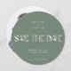 Cercle de typographie moderne et classe sauvegardez la carte de date avec du texte inspiré art teco sur le devant sur un arrière - plan vert sage et votre image de choix sur le dos. Customisez cette ronde enregistrer la carte de date avec votre propre photo, noms, date mariage et emplacement. Toutes les couleurs (texte et arrière - plan) sont personnalisables. Changez-le si vous voulez s'adapter à votre thème mariage.