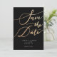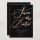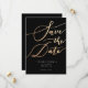 Élégante et simple carte de sauvegarde de date de mariage. Le texte de typographie écrit à la main est en faux paillettes d'or sur fond noir.