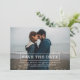 Photographie de typographie moderne Enregistrer la date Annonce avec une ligne de texte propre et moderne design boîte de texte en blanc. Ajoutez une photo et les détails de votre mariage pour customiser. La couleur Arrière - plan sur le côté arrière de l'invitation peut être modifiée pour compléter la photo ou pour ajouter votre couleur mariage.