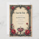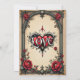 Une romance gothique. Un cadre de style gothique orné entourant un arrière - plan beige. Des roses rouges aux feuilles vert foncé sont disposées autour du cadre, particulièrement dans les coins. Au centre inférieur, il y a un emblème décoratif en forme de coeur avec le mot "LOVE" inscrit dans une police stylisée.