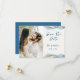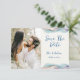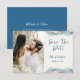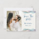 Une annonce de mariage "Save the Date" avec photo, conçue avec des accents de couleurs abstraites vives. Le texte du recto comprend : "Save the Date", les prénoms des mariés et la date du mariage sur fond blanc. Le verso comprend le texte : "Détails à suivre" et votre site web de mariage sur un fond bleu assorti avec un accent de couleur abstrait. Pour personnaliser, insérez simplement la photo de votre couple préférée dans notre modèle facile, en remplaçant l'image exemple. Déplacez la photo vers la gauche et assurez-vous qu'elle couvre la zone. Ensuite, insérez vos informations textuelles dans notre modèle, en remplaçant l'exemple. N'oubliez pas de consulter l'ensemble de la collection de mariage "Modern Abstract Color Wave" pour les cartes et accessoires assortis. Les couleurs de fond peuvent être modifiées à l'aide de notre outil de sélection de couleurs.