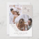 Carte de faire-part de mariage recto-verso en blanc et taupe avec vos initiales, photos qui se chevauchent et végétation avec des polices élégantes et propres. Carte de faire-part de mariage photo avec un design moderne personnalisé avec votre monogramme et vos photos, deux d'un côté et une de l'autre.