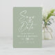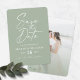 Simple Feuille verte avec Script Photo Wedding Enregistrer Les Cartes De Date. Ce design moderne mais classique est minimaliste et élégant avec une couleur simple et solide et de belle calligraphie signature texte. Montré dans la nouvelle colorway. Il comprend également une photo personnalisée en option sur le côté arrière. Ou simplement masquer le calque pour avoir un arrière - plan solide à la place. Pour en savoir plus, recherchez les collections mariages 2022 de Chic Paperie pour voir toutes les tendances design et couleurs mariages de cette année.