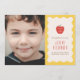 Celebrate your child's preschool graduation with this modern, charming graduation announcement. The front of the card features a sweet, halftone apple illustration with a "Class of (Year)" text overlay. Beneath the illustration is the message "the apple of our eye", as well as space for the name of your child and their school. The text and design is placed over a solid beige background, with a playful, yellow wavy frame border. This announcement also includes space for a large customer photo. The back of the card features a coordinating halftone apple pattern.