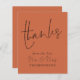 Script de budget Nouveau Mr Mme Mariage Terracotta Merci. Un prix budget PLUS PETIT 4,5” x 5,6” alternative. Disponible sur un PAPIER CARTONNÉ SEMI-BRILLANT 110 lb qui est l'option par défaut (recommandé pour les invitations), OU un PAPIER MAIS MINCE FINITION SATIN 80 lb (idéal pour les encarts). Les enveloppes sont une option supplémentaire et sont légèrement plus grandes que la taille de la carte. Merci et M & Mme sont écrits dans un script manuscrit élégant sur le devant et le reste du texte de chaque côté que vous pouvez facilement personnaliser avec vos noms et votre message de remerciement pour vos invités. Peut être changé en n'importe quelle couleur de votre choix via l'option "personnaliser davantage".