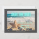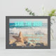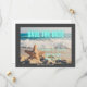 Faire-part de Save the Date moderne et non traditionnel avec une scène de plage (comprenant des vagues et des étoiles de mer dans le sable) sur fond photographique avec Save the Date en néon bleu aqua. Bordure gris foncé, Personnalisez avec les détails du couple de mariés.