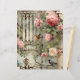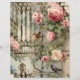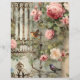 Un charmant papier à gratter de style victorien présentant une scène de jardin sereine, avec des roses et des oiseaux en fleurs perchés sur des portes en fer, dégageant un sentiment de tranquillité et la beauté de la nature.