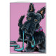 Sujet illustration d'un Scottie noir tenant anxieusement sa laisse. Encre et crayons colorés. c) Andie 2014.