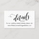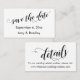 Gardez vos invités mariages dans la boucle avec tous vos détails avec ces inserts de faveur de mariage minutieux. Ces jolies cartes reflètent un style élégant et décontracté. Les superpositions de texte chic ont été conçues à l'aide d'une police de script moderne en noir. L'un des côtés dit "enregistrer la date" et l'autre dit simplement "détails". Utilisez les champs modèles pour customiser ces cartes de boîtier avec vos informations personnelles. Imprimé à l'aide de la "technologie carte de visite", la taille pratique sera facile à garder à portée de main. Envoyez-les avec vos envois traditionnels, et gardez quelques-uns autour pour les partager avec ceux qui ont besoin d'un ou deux supplémentaires! L'arrière - plan est blanc et cette couleur modifiable peut être changée en n'importe quoi dans votre palette de mariages que vous choisissez ; tout le texte modifiable apparaît en noir. // 99 // Conçu par Melody Watson pour Paper Muserie.