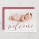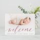 Un design de faire-part de naissance doux et élégant avec un fond de saignement intégral photo horizontale ou orientée paysage avec "bienvenue" superposé dans des lettres de script de calligraphie chic. Le nom et les statistiques de naissance de votre bébé apparaissent en dessous. Ajoutez trois photos de carré supplémentaires à l'arrière, ainsi qu'un message personnel.
