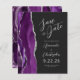 Le bord gauche de cet élégant mariage moderne, sauf la carte de date, est doté d'une bordure d'aquarelle violette ornée d'une parties scintillant en faux argent. Le texte personnalisable combine un script gris argenté et des polices sans serif sur un arrière - plan noir ardoise. L'envers est assorti d'un design d'agate violet et argenté.