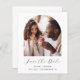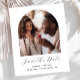 Cette simple et minimaliste carte Save the Date présente une arche photo boho au-dessus des mots "Save the Date" dans un élégant script d'écriture en noir, suivi des noms du couple, date mariage et ville en sans serif police sur un arrière - plan blanc. Ajoutez un message plus détaillé avec des informations supplémentaires sur l'inverse.
