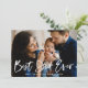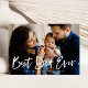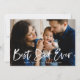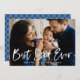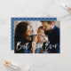 Carte de fête des pères moderne mignonne avec votre photo de famille préférée avec "Best Dad Ever" dans une superposition de texte blanc, lettré à la main. Personnalisez l'avant de la carte de fête des pères en ajoutant un message d'accueil personnalisé et votre nom. La carte revient à un motif plaid bleu et blanc.