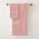 Moderne rose roux monogrammé et nom serviette de bain personnalisée ensemble avec un blanc chic signature féminine.