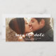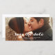 Enregistrer notre date | Script moderne Enregistrer le Carte photo de date. Design par Elke Clarke© Gras, simple, moderne, écriture de texte blanc superposé. Entièrement personnalisable si vous sélectionnez "customiser". Remplacez l'exemple de photo montré par votre propre photo fiançailles. Autres couleurs disponibles.