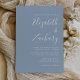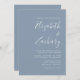 Cette faire-part de mariage moderne simple présente du texte blanc sur un arrière - plan bleu poussiéreux. Ajoutez les noms de la mariée et du marié en calligraphie stylisée et les détails en police sans serif. L'envers est une teinte assortie de bleu foncé.
