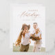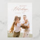 Moderne minimaliste, design de cartes de vacances joyeuses avec un élégant script tendance en papier or rose, avec photo de famille personnalisée, simple et unique.