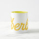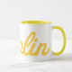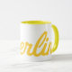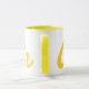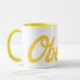 Profitez de votre café avec flair dans cette tasse jaune à deux tons avec texte jaune script Oberlin.