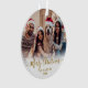 Script Gold Minimaliste Moderne 2 Photo Joyeux Script de Noël Carte d'ornement de Noël. Ce modèle festif, simple minimaliste, fantasque deux photos de vacances carte de voeux avec nom de famille, année et un texte de bienvenue "Joyeux Noël" qui est écrit dans une lettre tourbillonnant à la main police swash-tail or calligraphie script superposition photo sur dégradé blanc. Jolie carte de voeux pour votre famille et vos amis pendant la période de Noël.