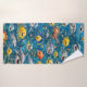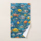 Bathroom with this ultra cheerful three-piece towel set featuring our smiling sea design. This set includes a washcloth hand towel and bath towel all adorned with a vibrant underwater scene a friendly sharks puffer fish and tropical fish with big happy grains made from soft absorbent fabric. These towels are perfect for kids bathtime or for anyone who wants to start their day with a splash of colour and positivity.